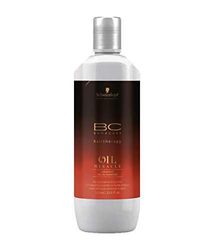 Productos de peluquería Schwarzkopf BC OIL MIRACLE Shampoo. Champú para cabello normal a grueso que desafía la gravedad y aporta un brillo espectacular. Está formulado con aceite de argán, que deja un cabello más suave sin apelmazarlo. Aplicar sobre el cabello mojado, masajear, dejar actuar entre 1 y 2 minutos y enjuagar.